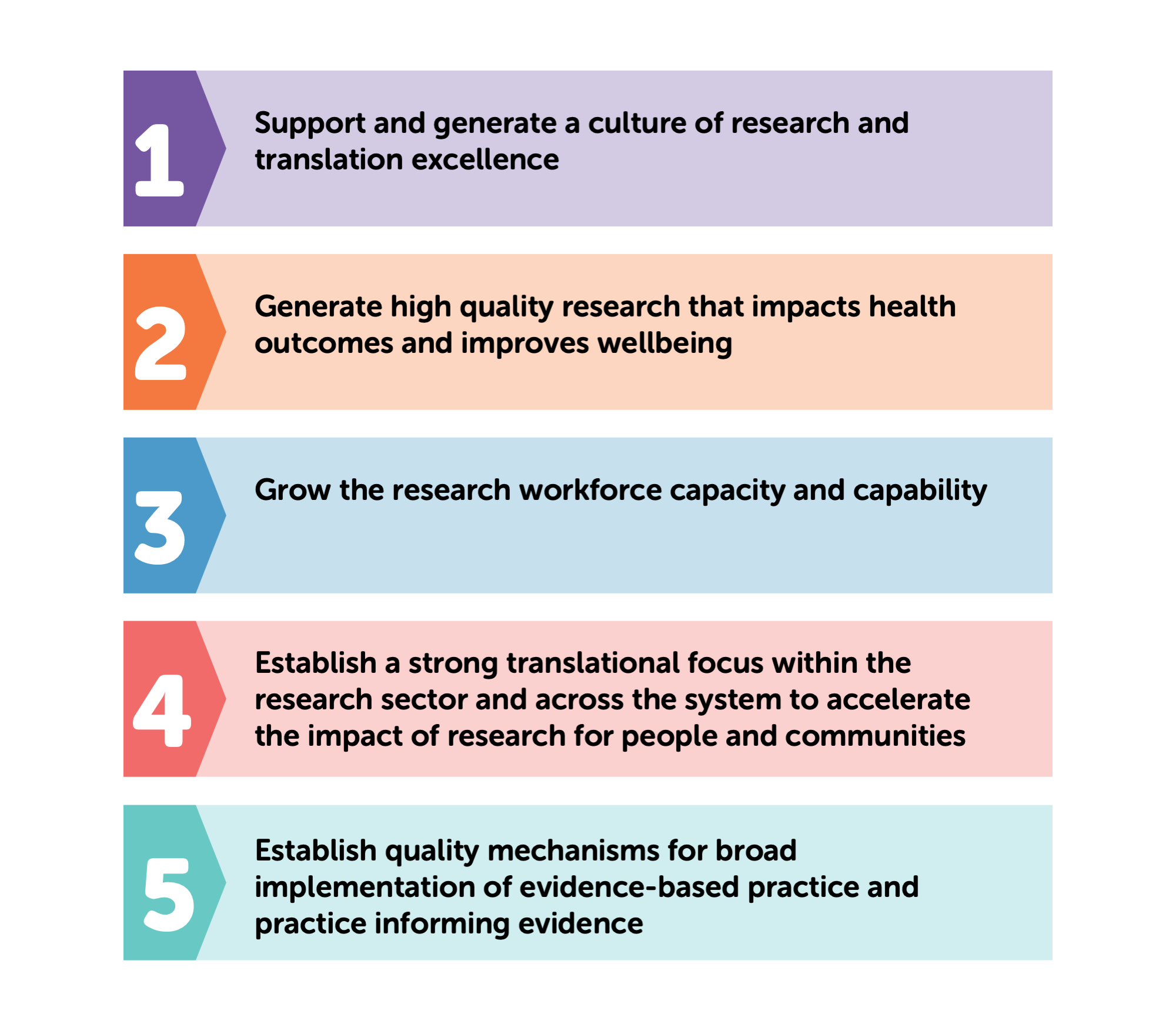 The Strategies in this document help focus our thinking and our actions. We will build on existing strengths to ensure Australia leads with a culture of research and translation excellence, we will generate high qualify research with impact and grow the research workforce. Importantly, we aim to do better with translating research from laboratories in to real world settings, and to ensure that evidence is broadly implemented across all areas within the system.