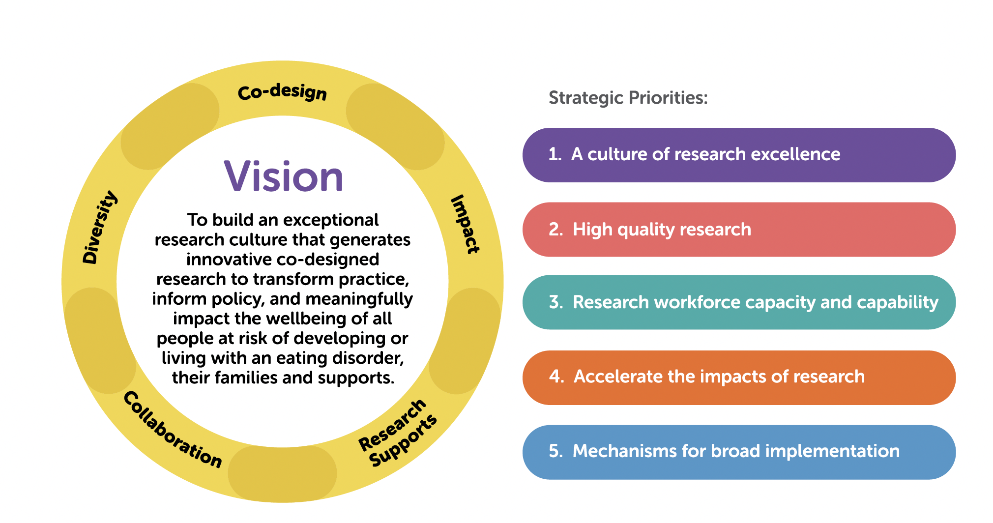 We are united in our determination to prevent eating disorders and improve the health and wellbeing of those at risk of developing an eating disorder, their families and supports in Australia. The co-designed strategic priorities, recommendations and actions outlined in this document identify how we can support that objective by improving knowledge generation and the use of knowledge in practice in Australia.