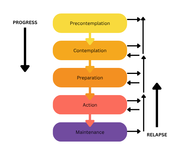 Prochaska and DiClemente's (1982) transtheoretical model of behaviour change is a way of understanding an individual's readiness for making behavioural change. The model is helpful for conceptualizing the mental states of individuals at different stages of their change journey and tailoring treatment accordingly. The Stages of Change model below illustrates the stages of this model (precontemplation, contemplation, preparation, action, maintenance).