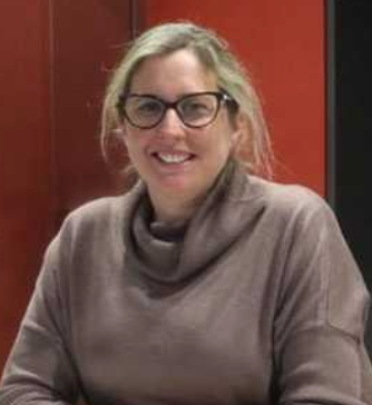 A smiling woman with glasses and blonde hair is standing in front of a red wall.