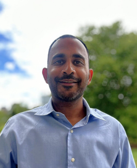 A smiling young man in a suit and tie stands in front of a brick wall.