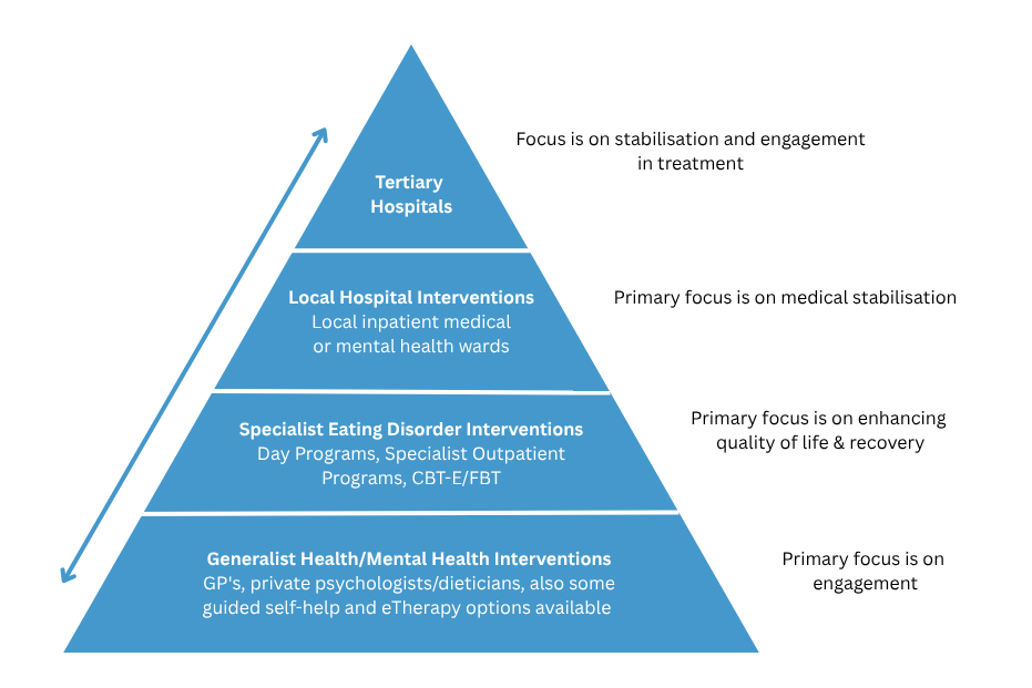 Tertiary Hospitals – provide specialist inpatient treatment with a multidisciplinary team and is suitable for individuals with the most severe eating disorders and complex presentations. The primary focus is on medical stabilisation and engagement in treatment to prepare the individual for treatment post discharge from hospital.