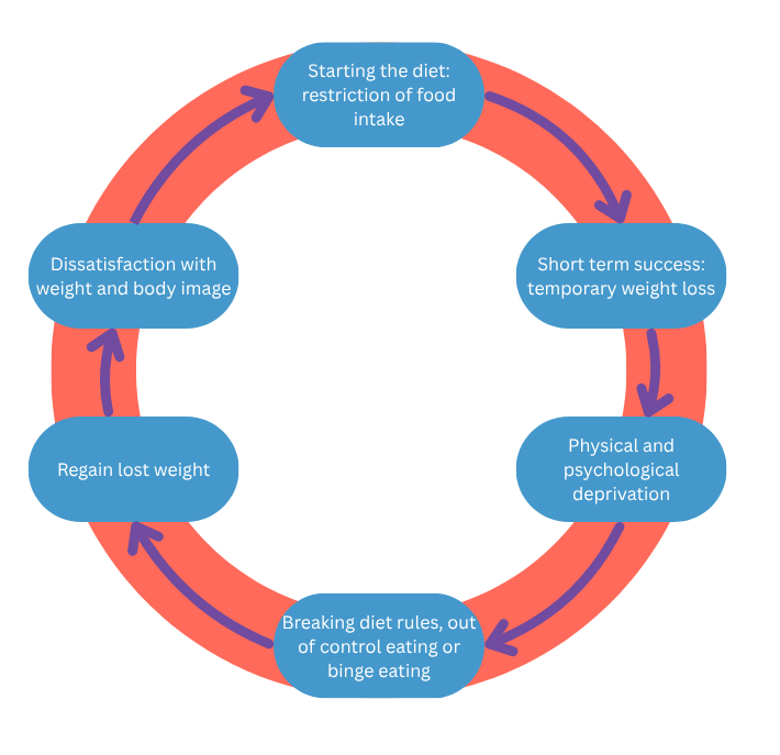 Diets are a recipe for failure! At least 75% of individuals who start a diet, will eventually regain the weight that they had lost (and more) (McEvedy et al, 2017; Saris, 2001; Anderson et al, 2001; Purcell et al, 2014). Many individuals conclude that they, not the diet, is the problem. This often leads to individuals attempting another diet, and therefore being stuck in the diet cycle.