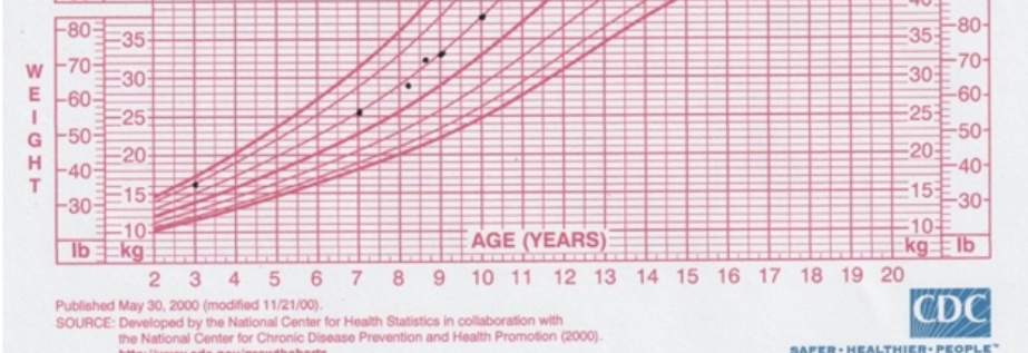 The BMI charts are a calculation of weight and height. Here the aim is for a BMI on the 50th percentile, indicating that the weight is appropriate for height.