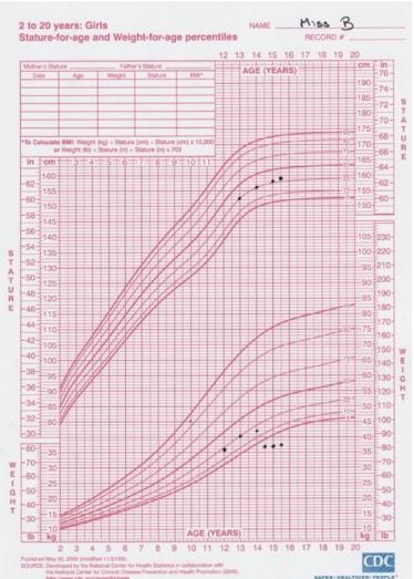 The BMI is then plotted on the BMI centile charts. Miss B’s height is tracking on the 25th percentile, however, between 14 and 14 and a half years of age her weight dropped from around the 25th percentile to <5th percentile and so did her BMI.